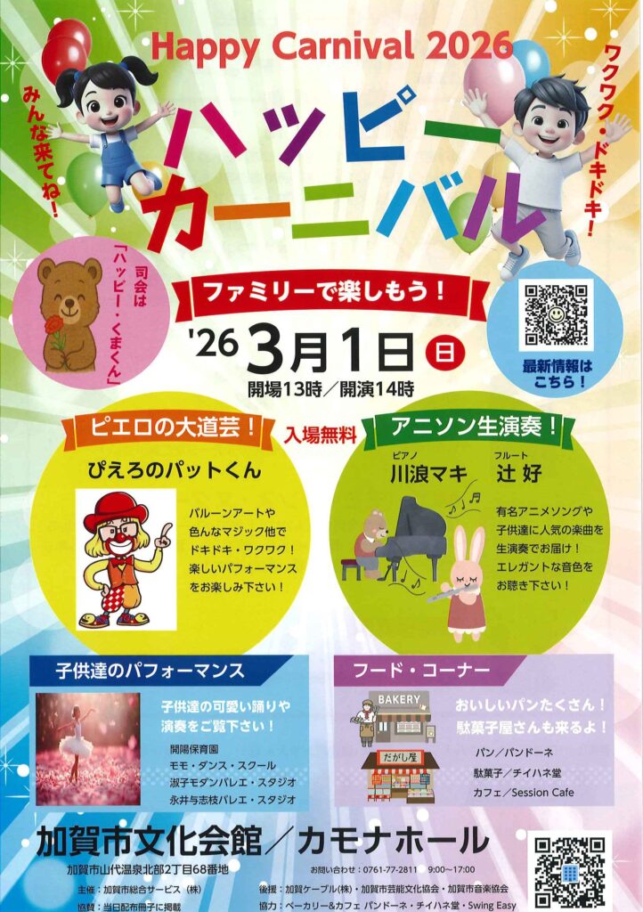 | 会 場 | 加賀市文化会館 カモナホール 【加賀市山代温泉北部2丁目68番地 ☎0761-77-2811】 |